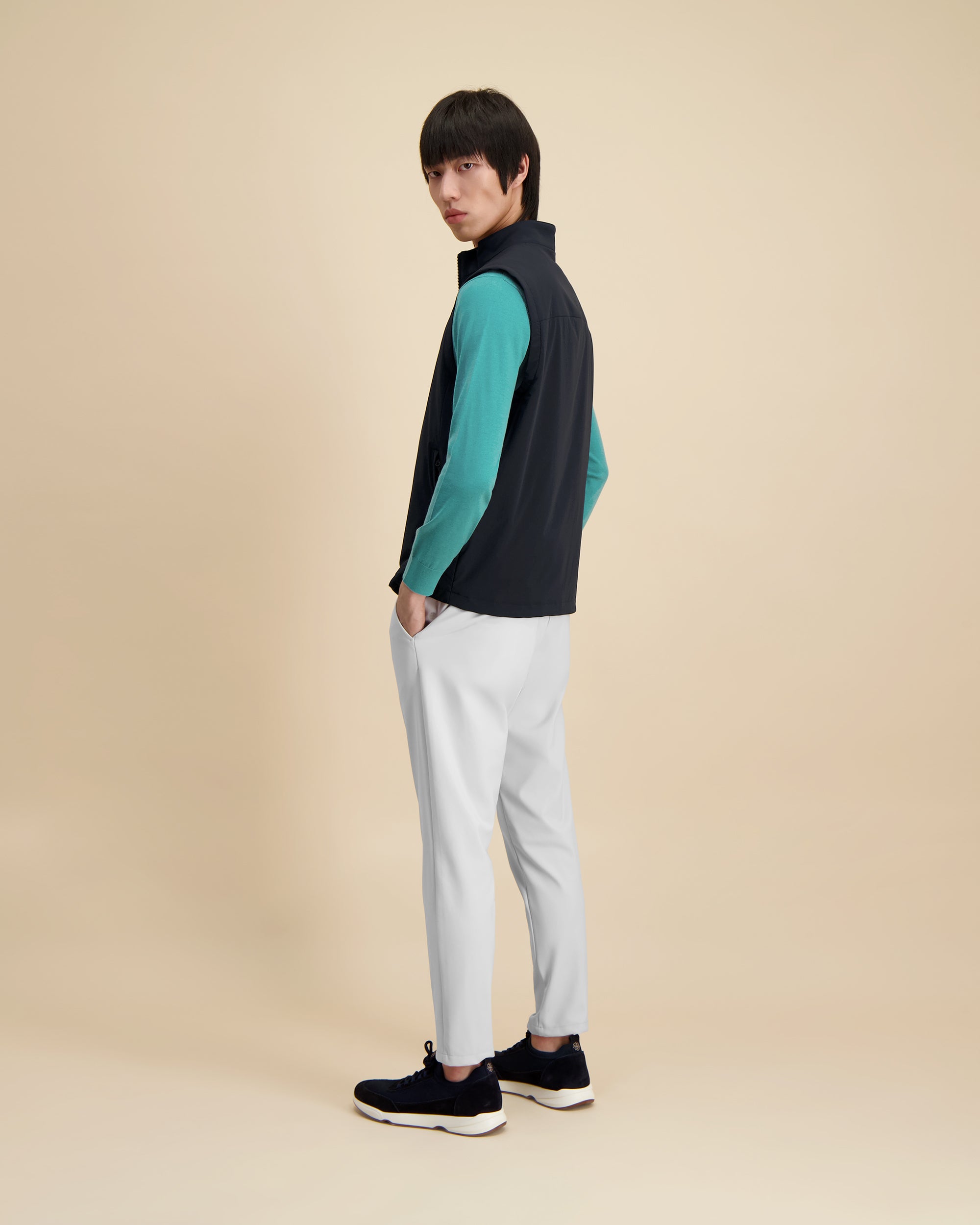 Technische stof ontworpen voor lichtheid, ademend vermogen en natuurlijke beweging. De verfijnde textuur zorgt voor een gestructureerd gevoel met een soepele valling en comfort gedurende de hele dag.