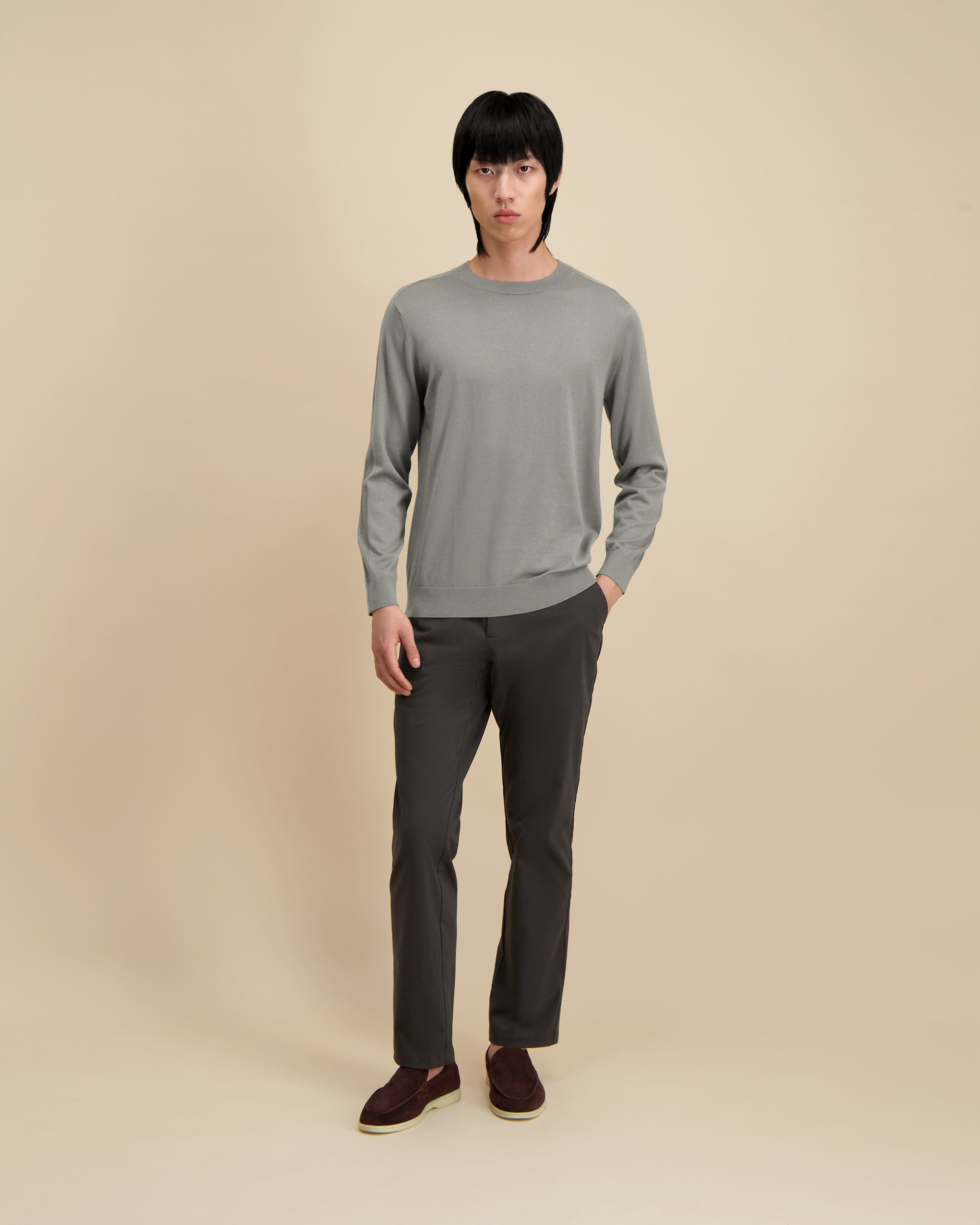Zachte gebreide wol met een subtiele weefstructuur die zorgt voor natuurlijke isolatie en een comfortabel, ademend gevoel.