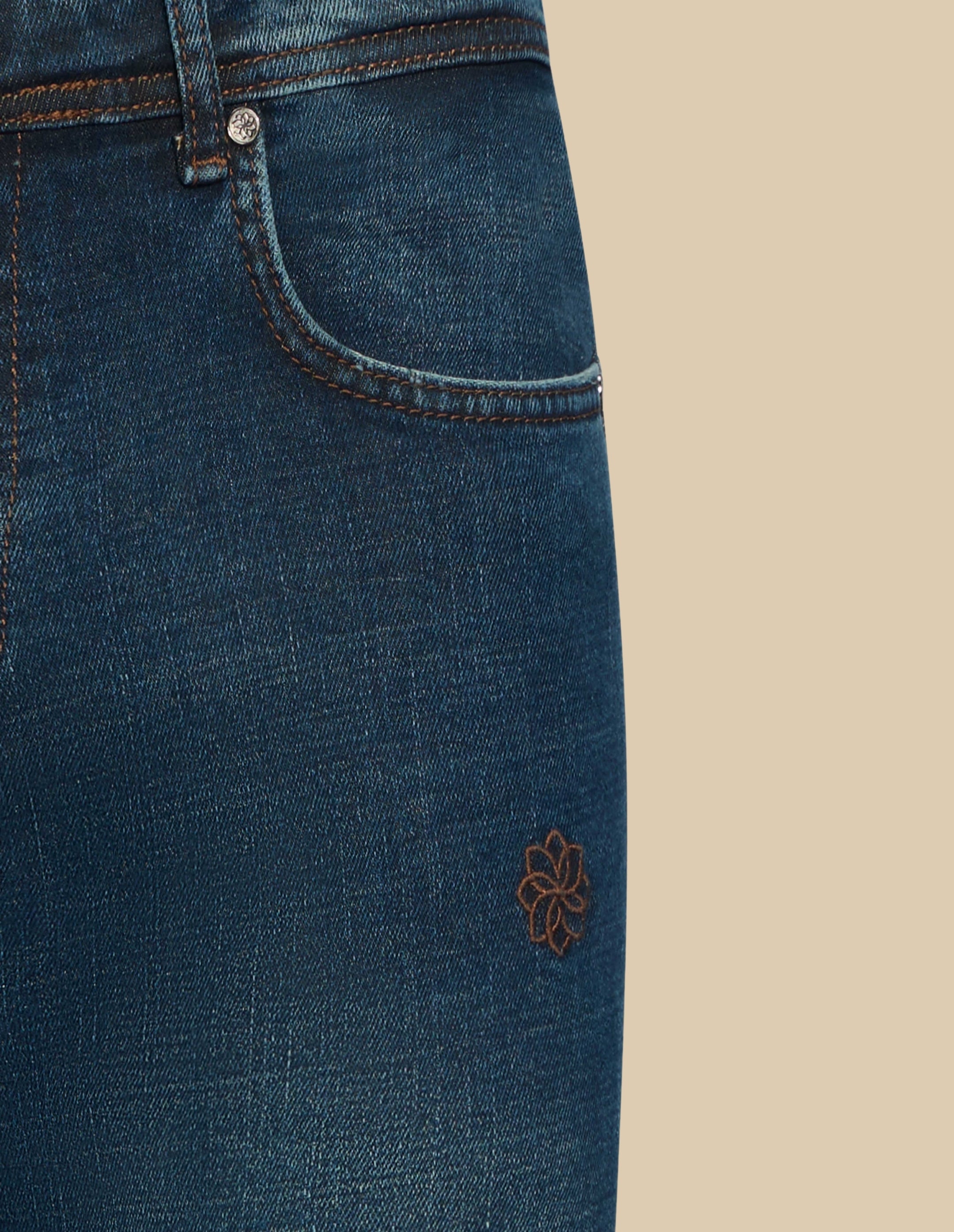 Hoogwaardige denim, samengesteld voor duurzaamheid en ademend vermogen, met een subtiele textuur en comfortabele beweging.