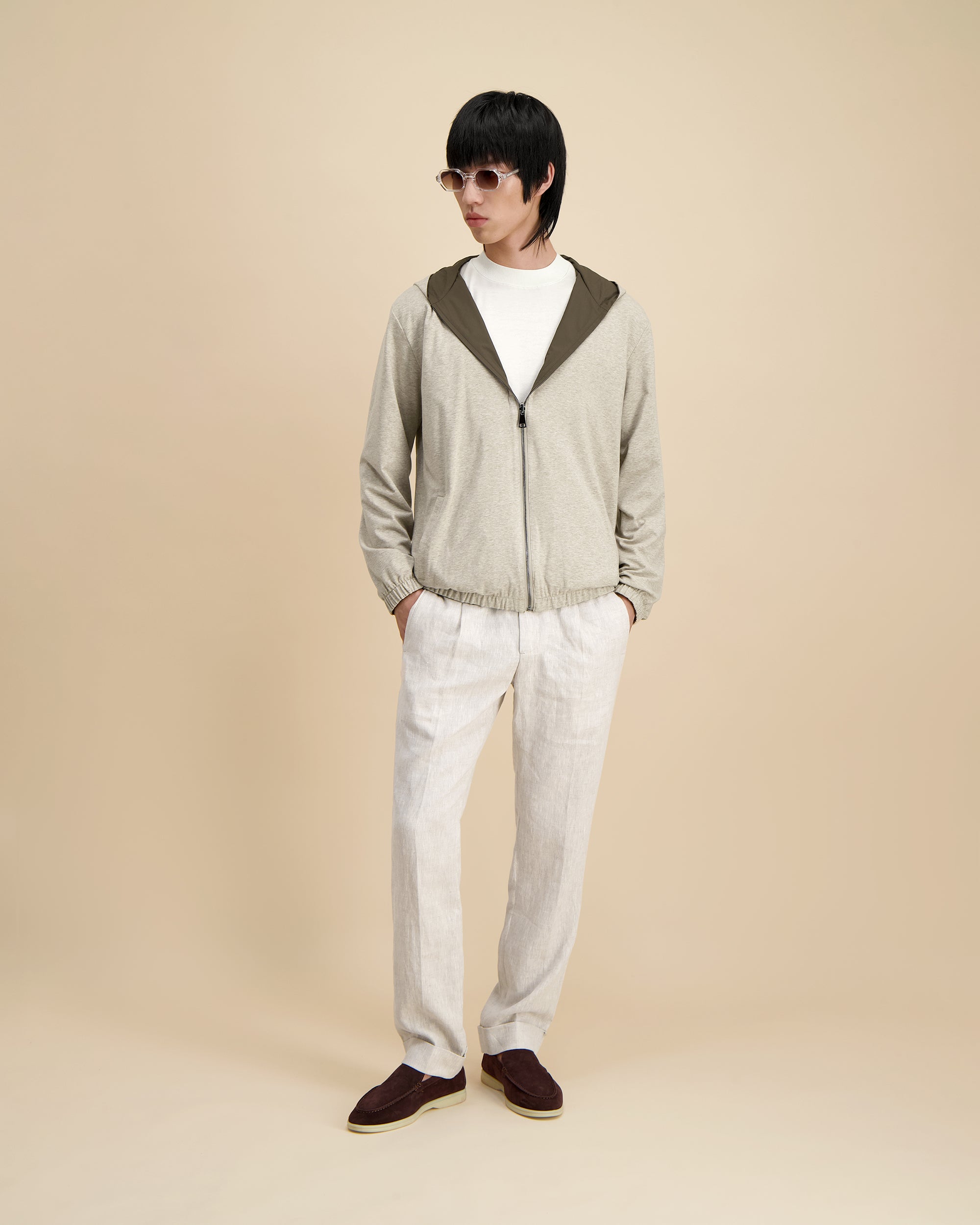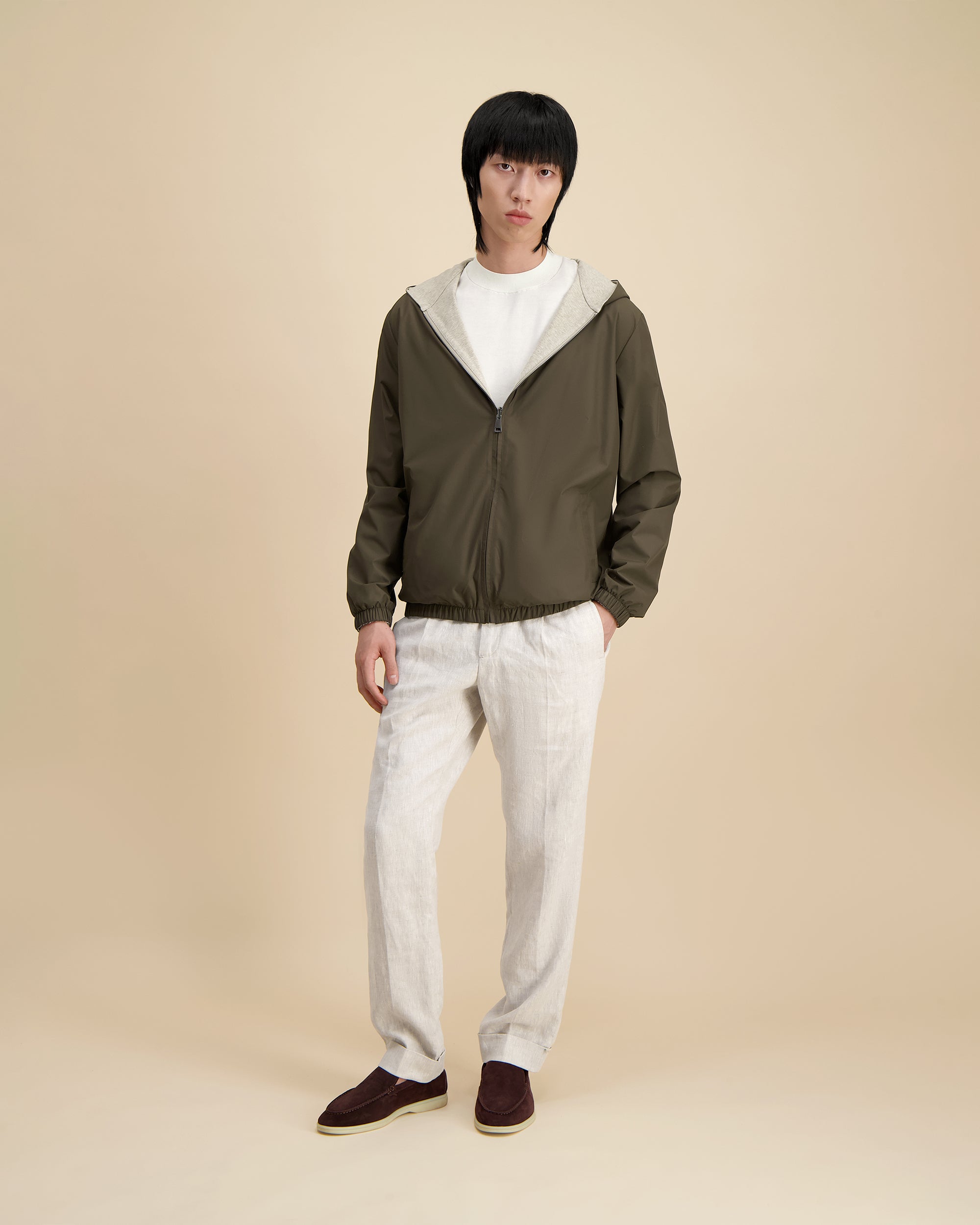 Hoogwaardige denim, samengesteld voor duurzaamheid en ademend vermogen, met een subtiele textuur en comfortabele beweging.