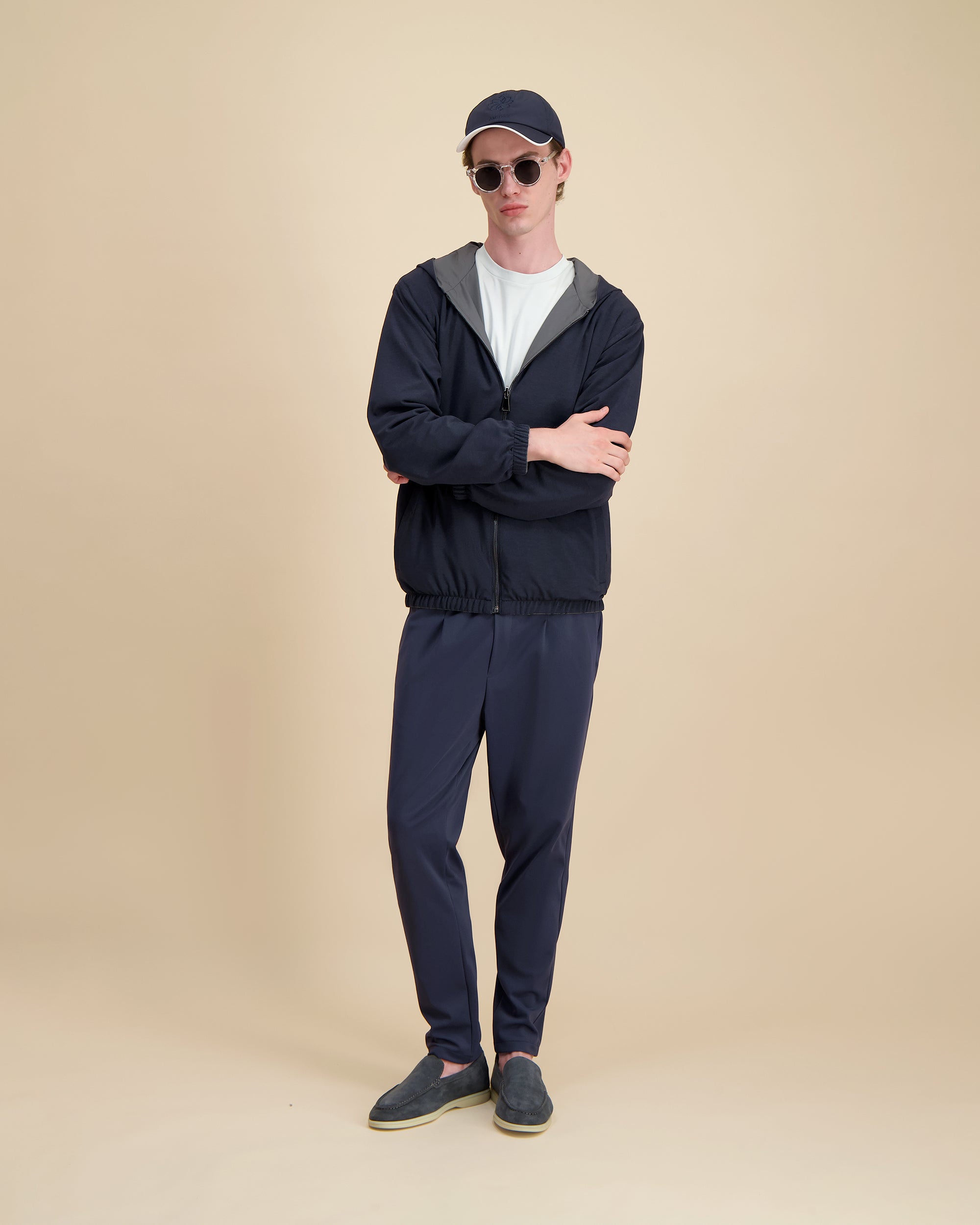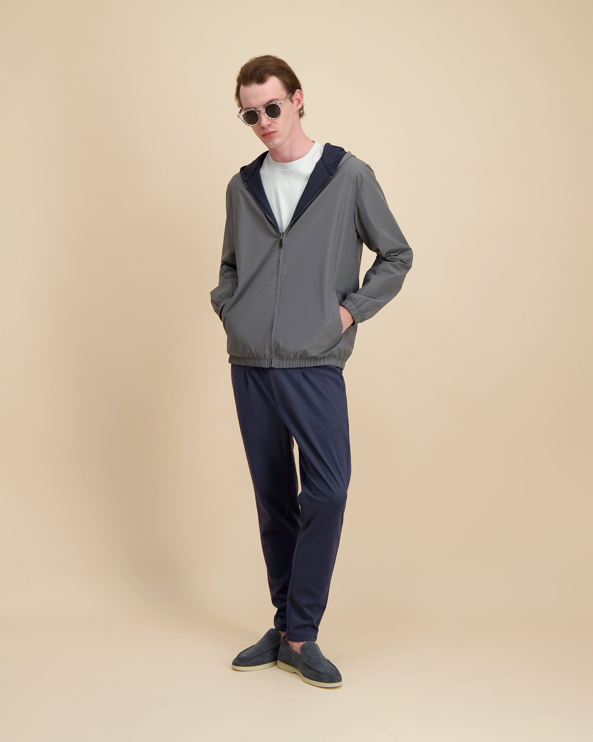 Hoogwaardige denim, samengesteld voor duurzaamheid en ademend vermogen, met een subtiele textuur en comfortabele beweging.
