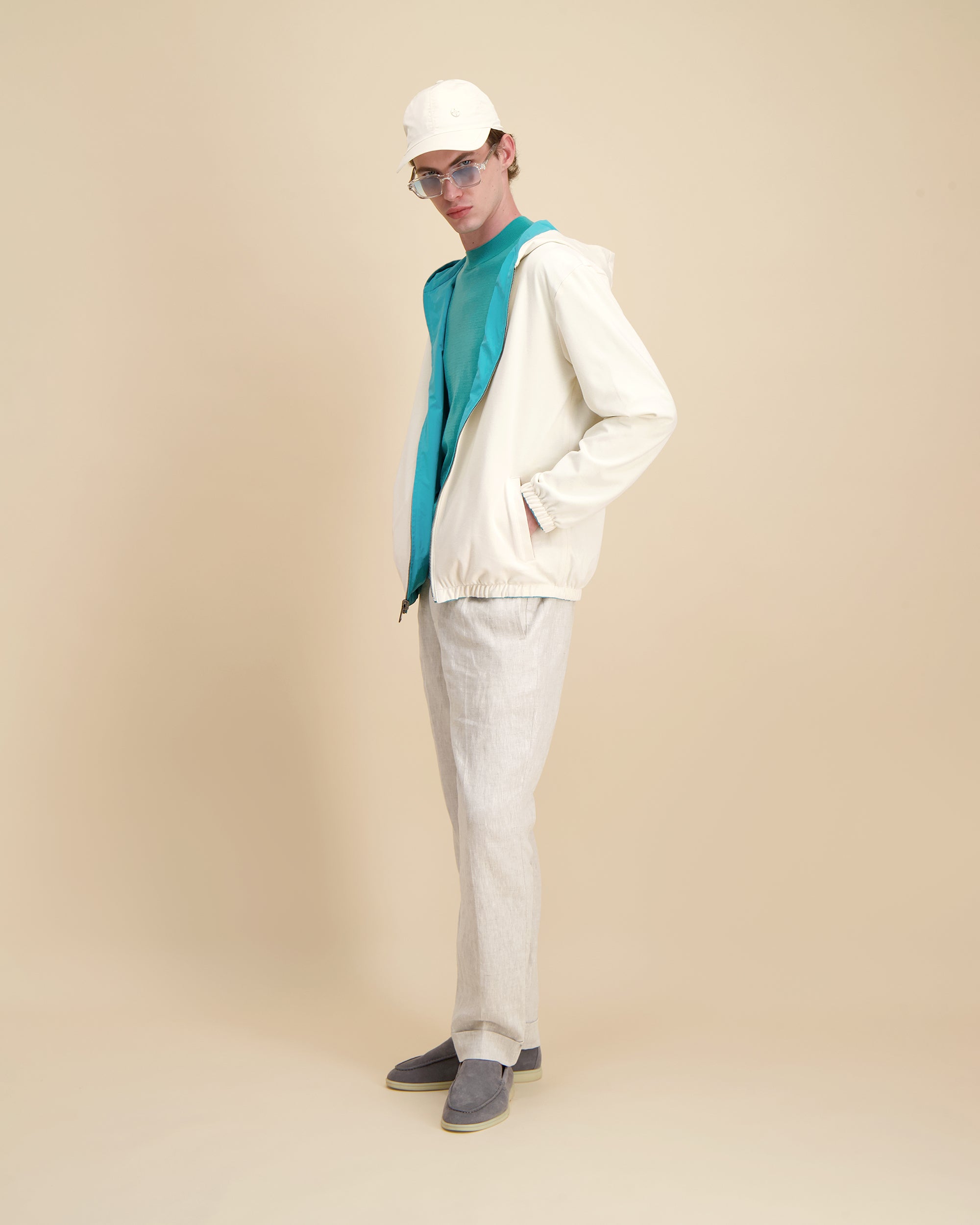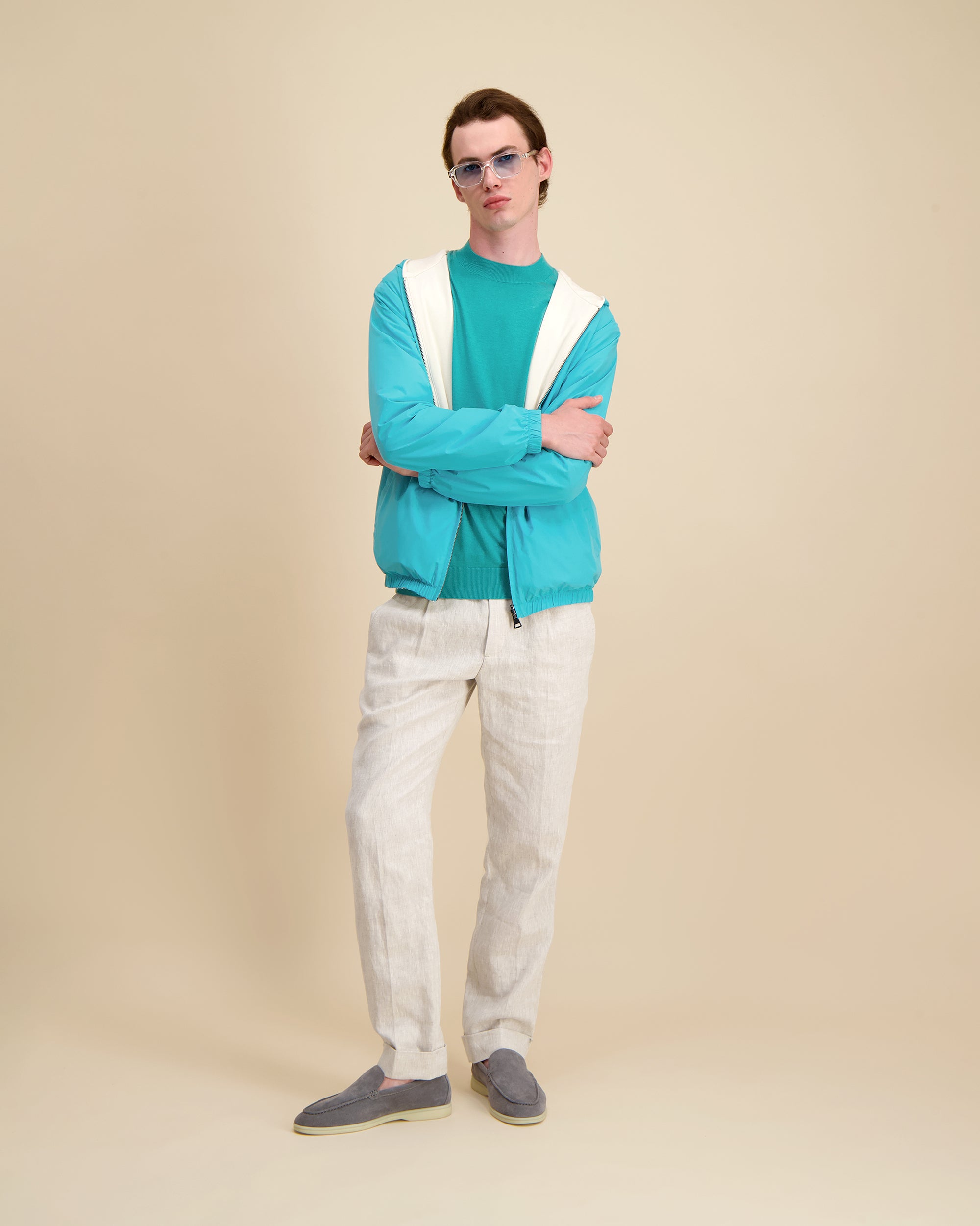 Hoogwaardige denim, samengesteld voor duurzaamheid en ademend vermogen, met een subtiele textuur en comfortabele beweging.